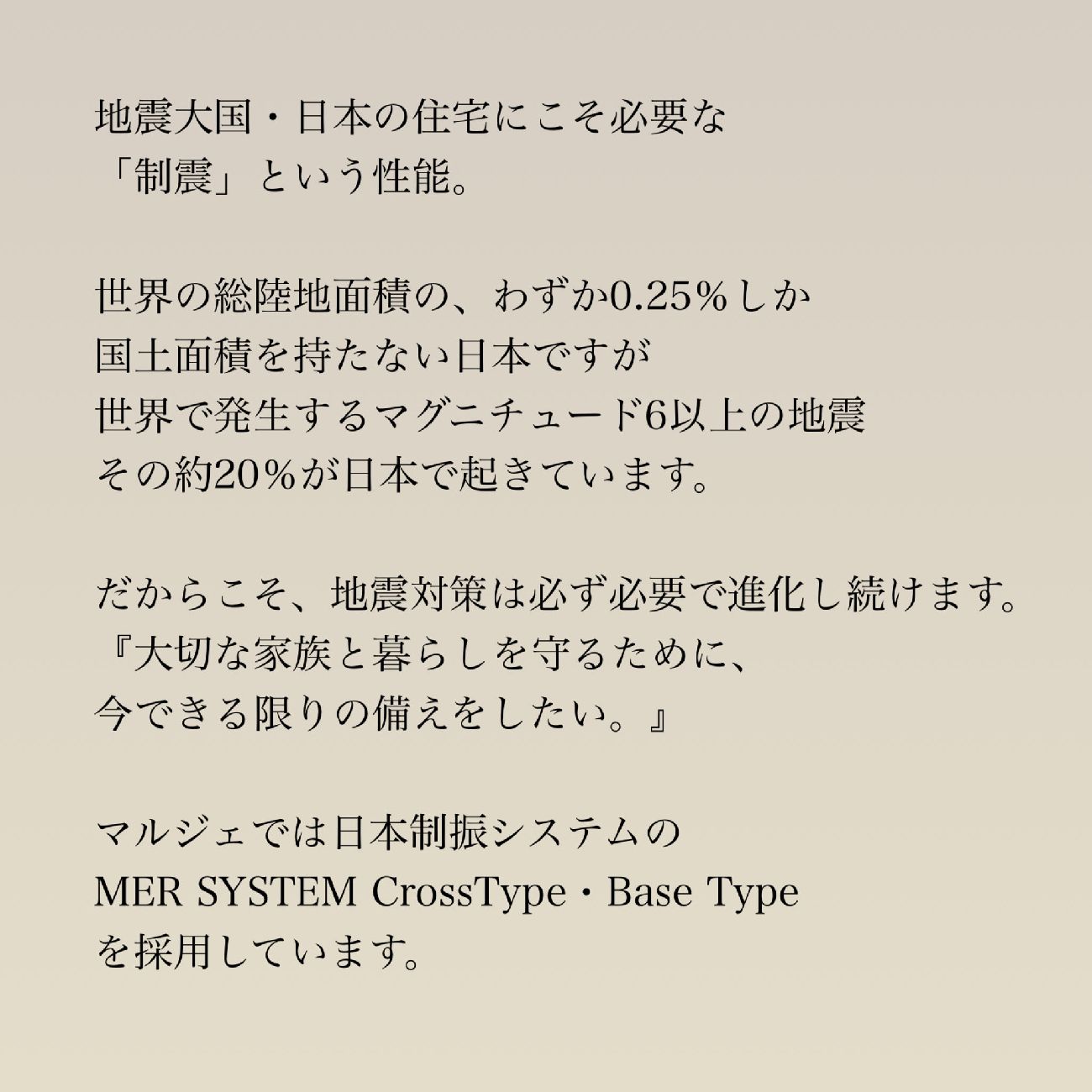 マルジェでは2階建構造の耐震最高等級3取得以外にも近年多発する地震対策への取り組みとして2つの制振システムを採用しております。