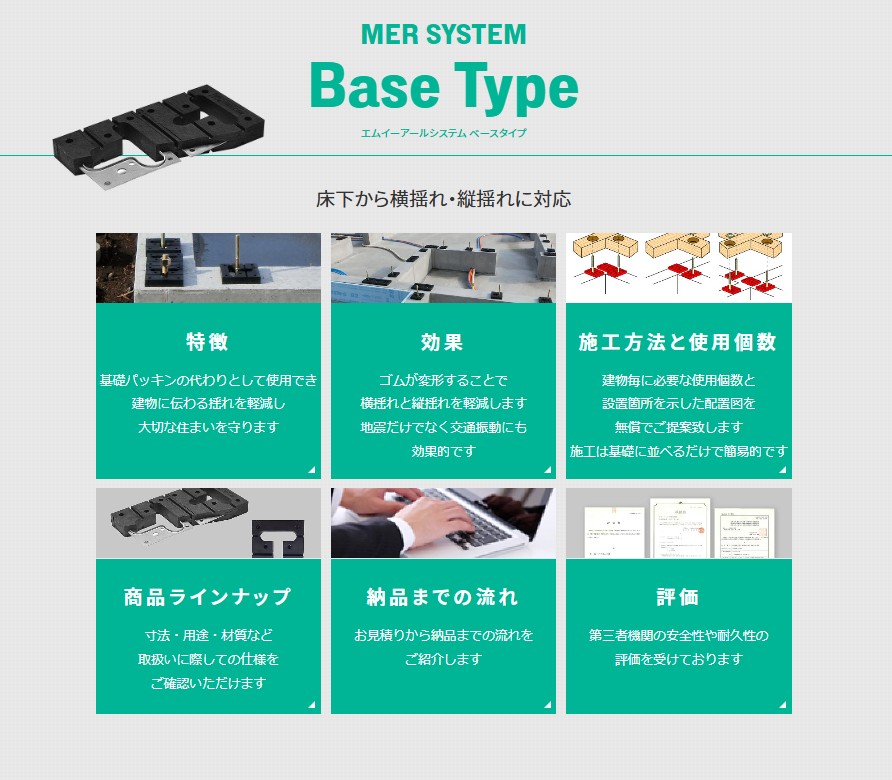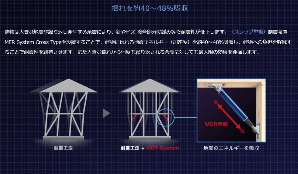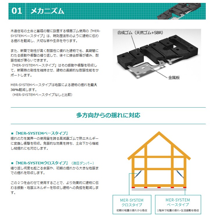 『MER-SYSTEMベースタイプ』はその振動や衝撃を吸収して、新築時の剛性を維持させ、建物の長期的な耐震性能をサポートします。