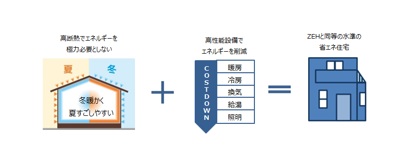 ![]() ZEH住宅とは・・・”net Zero Energy House”(ネット・ゼロ・エネルギー・ハウス)の略で、「エネルギー収支をゼロ以下にする家」のこと。家庭で消費するエネルギーが太陽光発電などで生み出すエネルギーが上回る住宅を指します。 |