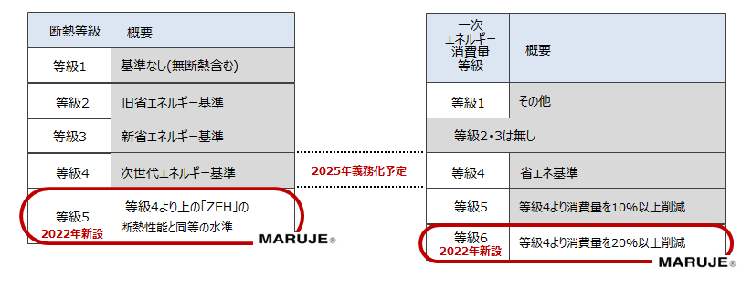 イメージ ![]() 断熱等性能等級とは・・・品確法(法律)に規程された省エネ性能を表す等級のこと。外壁、窓等を通しての熱の損失を防止する性能。 一次エネルギー消費量等級とは・・・2013年に見直された省エネルギー基準にとって新たに追加された指標。一次エネルギー消費量の削減の程度を表す性能。※一次エネルギー(暖房・冷房・換気・照明・給湯等の住宅に関するエネルギー) |