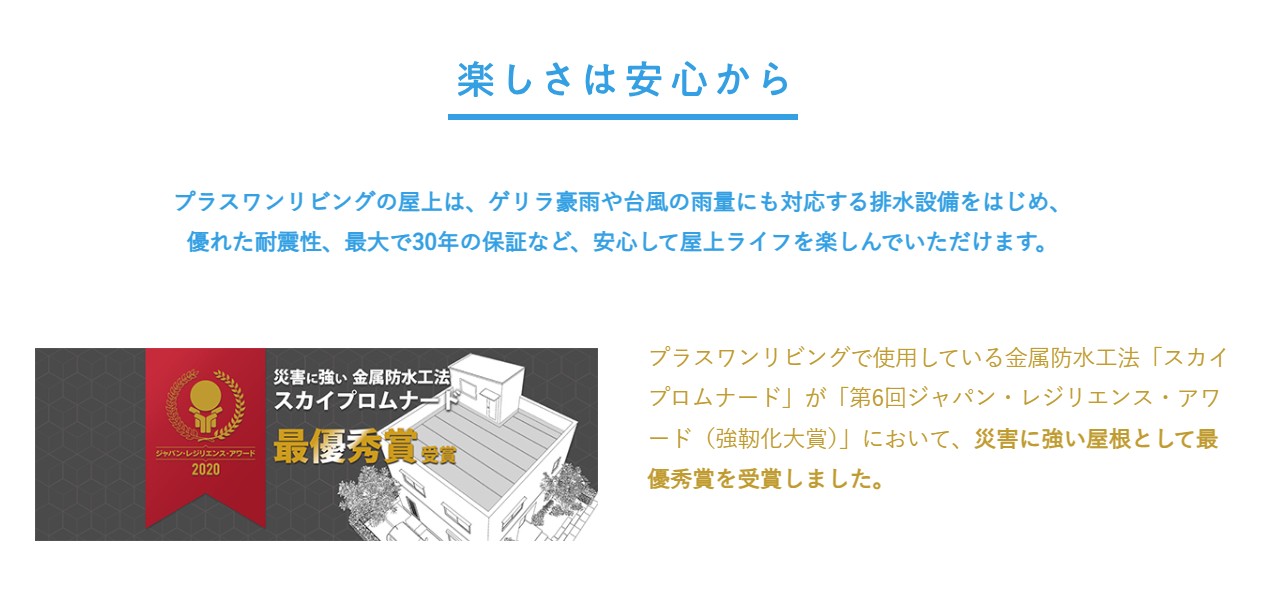 マルジェの住宅では、屋根の代わりに「屋上庭園」を取り入れることで、お客様の生活スペースの最大化をご提案しています。