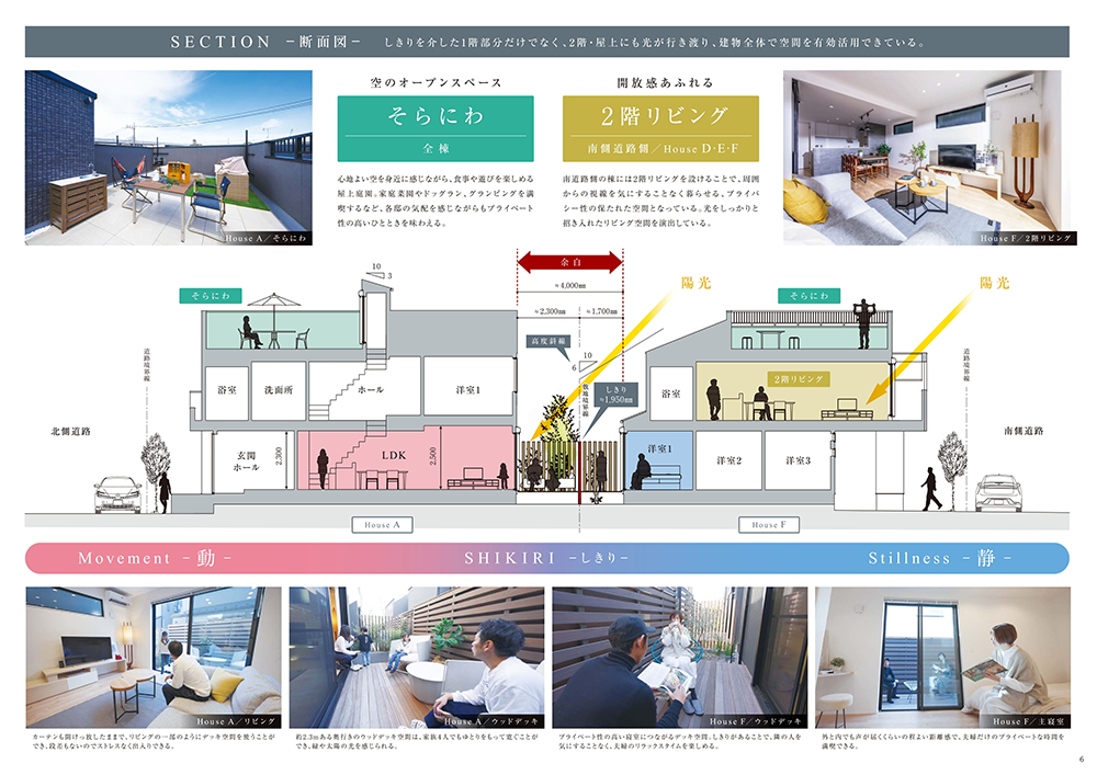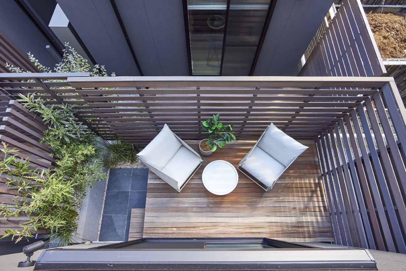 各邸のふれあいDECKが街の中央へ向くように配置することで、陽光と風を豊かに堪能できる空間を生み出しました。
