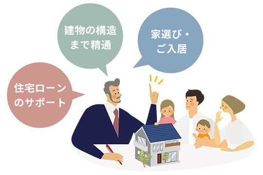 住宅ローンや建物の構造にまで精通しているため、住宅の専門知識がない方にも、分かりやすくプロの視点から家選びのアドバイスや住宅ローンのサポートをさせていただきます。安心してお任せください。