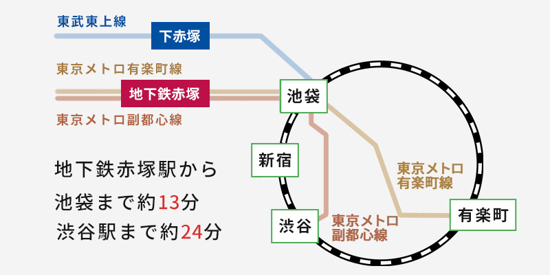 赤塚エリアには、「地下鉄赤塚駅」と「下赤塚駅」の2駅があります。「地下鉄赤塚駅」からは、有楽町線と副都心線の2路線が利用でき、「池袋駅」までわずか13分、「新宿三丁目駅」や「渋谷駅」へも乗り換えなしで18〜24分と、都心がとても身近に感じられます。朝の忙しい時間も、ゆとりを持って出かけられるのは嬉しいポイントです。