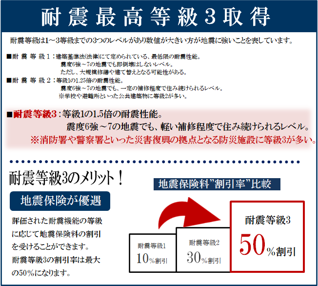 耐震等級は1〜3等級までの3つのレベルがあり数値が大きい方が地震に強いことを表しています。建築基準法では数百年に一度発生する地震に対して倒壊・崩壊しない。(震度6強から7を想定)数十年に一度発生する地震に対して損傷しない。(震度5強程度を想定)とされる耐震性を1等級として定めています。