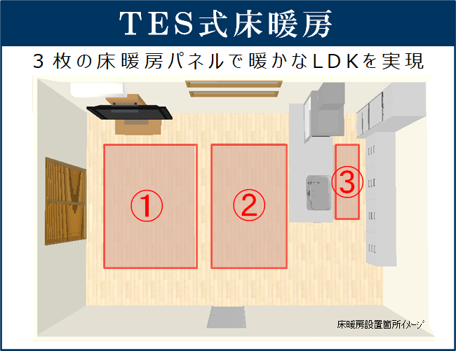 一般的な建売では1~2箇所の設置が多い中、マルジェのデザイナーズハウスではリビングダイニング部分に2箇所、キッチンに1箇所の計3箇所が標準で備わっておりLDKのどこにいても暖かく過ごすことができます。