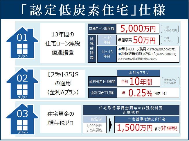 今後、新築住宅に改正省エネ基準を義務化されることが予定されておりますがマルジェはその先駆けとして低炭素住宅の認定を取得しております。メリットとして住宅ローン減税の控除額が一般住宅に比べ優遇されます。また、住宅購入する際に課税される登録免許税も一般住宅より引き下げられます。(所有権保存登記の税率が0.15%から0.1%に引き下げ。所有権移転登記の税率が0.3%から0.1%に引き下げ。)