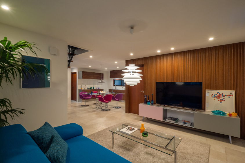 ペンハーゲンリブのアクセント壁で高級感をもたせたリビング。(現地モデルハウス)(内装)