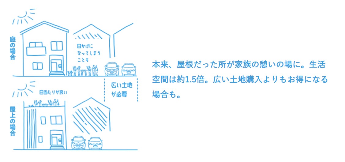 マルジェの住宅では、屋根の代わりに「屋上庭園」を取り入れることで、お客様の生活スペースの最大化をご提案しています。
