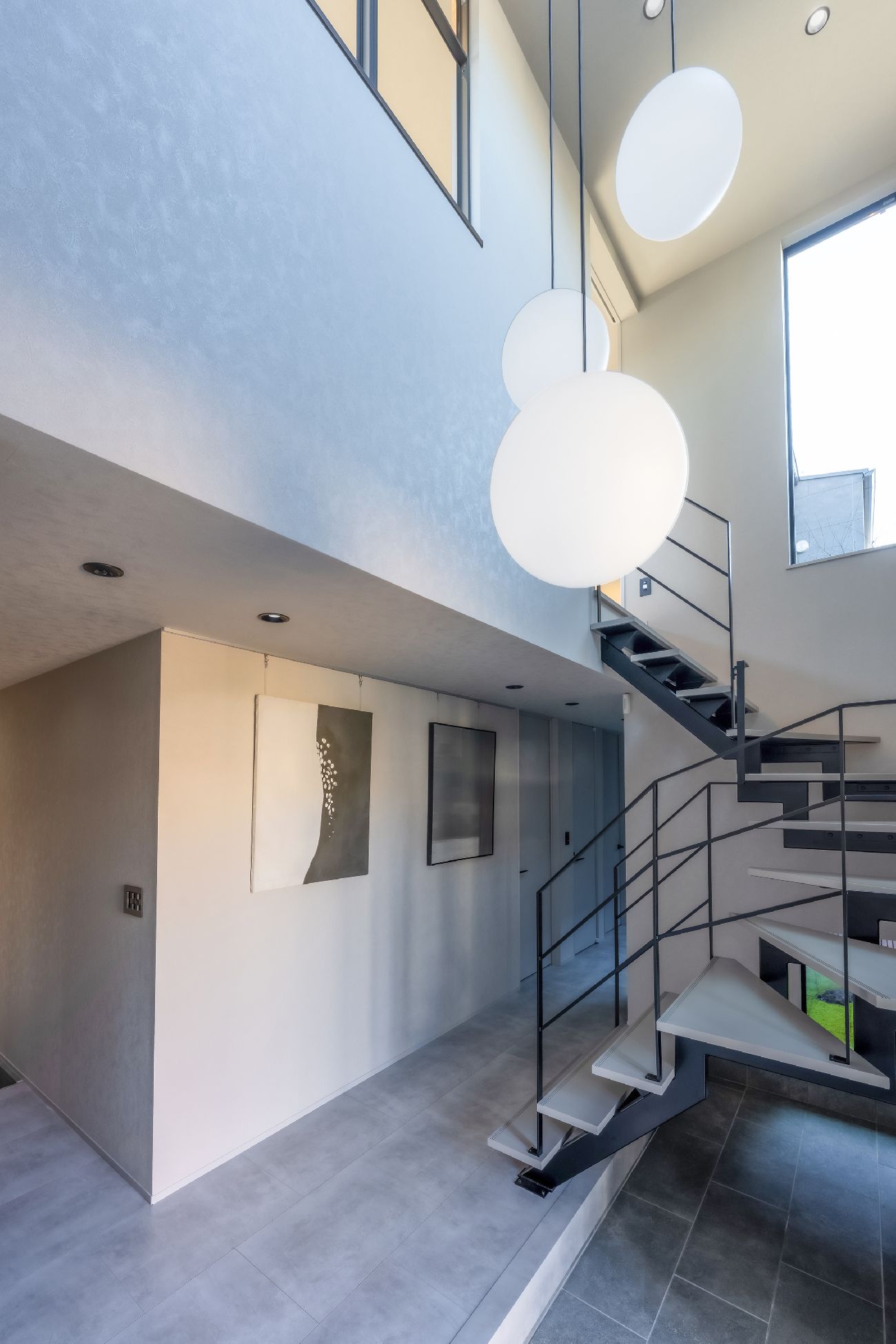 「光と影が交差する、ギャラリーのようなエントランス」 扉を開けた瞬間、目に飛び込んでくるのは、オブジェのように美しい鉄骨階段。 あえて蹴込み板のないスケルトン構造にすることで、視線が抜け、空間をより広く、ドラマチックに演出します。
