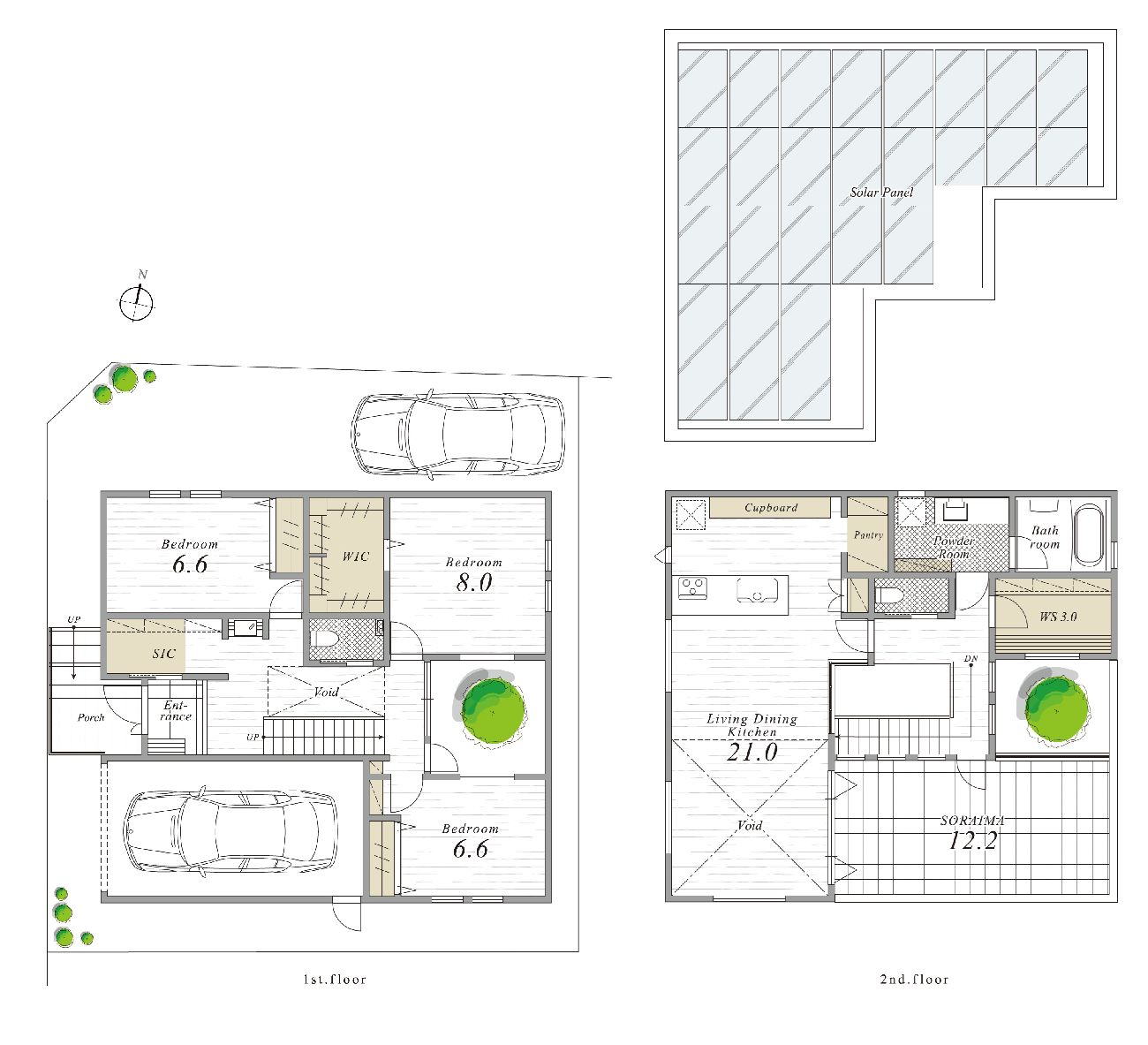2階LDKの先に広がるのは、12.2帖もの広さを誇る大型バルコニー「SORAIMA(ソライマ)」。リビングとフラットにつながるこの空間は、まさに「第2のリビング」です。週末のブランチや、夜空を眺めながらの晩酌、お子様のプール遊びなど使い方は自由自在。 吹き抜け(Void)を介して1階ともつながる家族の気配を感じられる間取りです。