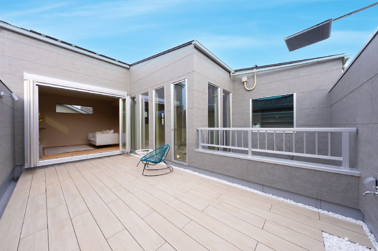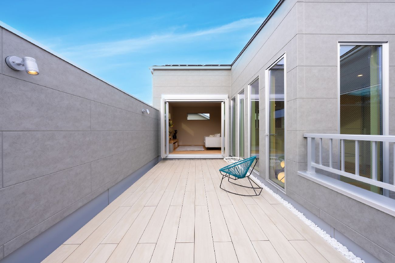 リビングからフラットに続く大型バルコニーはプライベートを守り、近隣の視線を気にすることなくカーテンを開け放した開放的な暮らしができるハイウォール仕様。床材には温かみのある木目調タイル。さらに、耐久性とメンテナンス性に優れた「安心の金属防水施工」を採用しており、長きにわたって美しさと防水性能を維持します。週末のブランチや、夜の星空観賞など、暮らしの幅が大きく広がる特別な場所です。