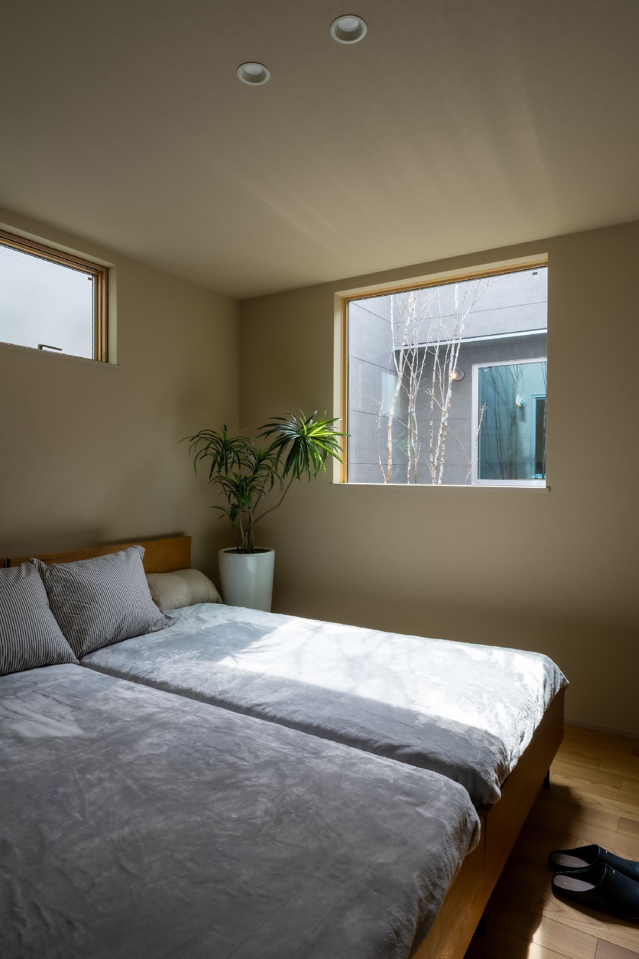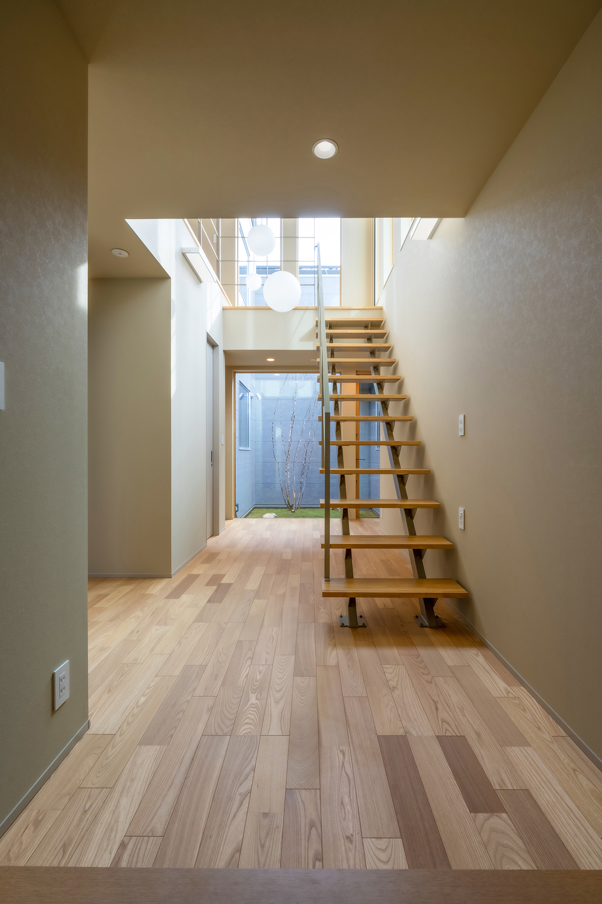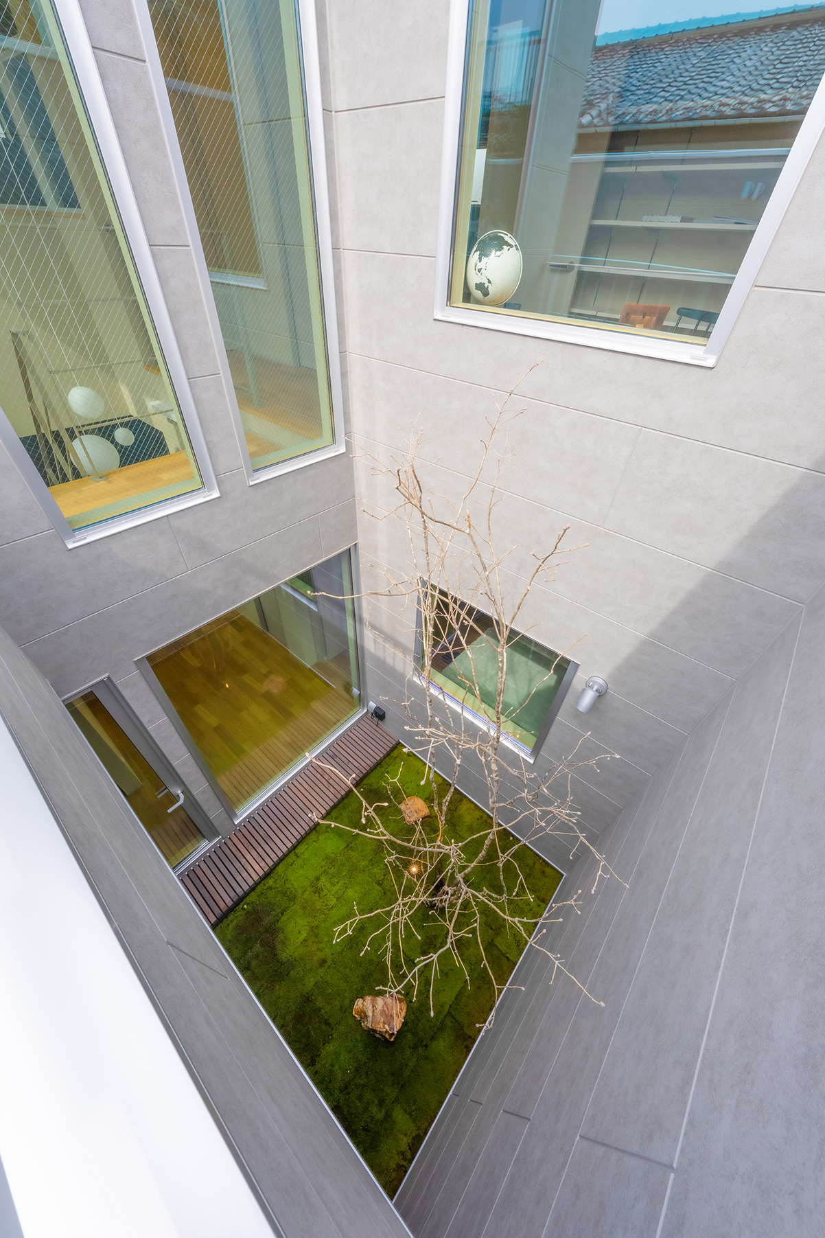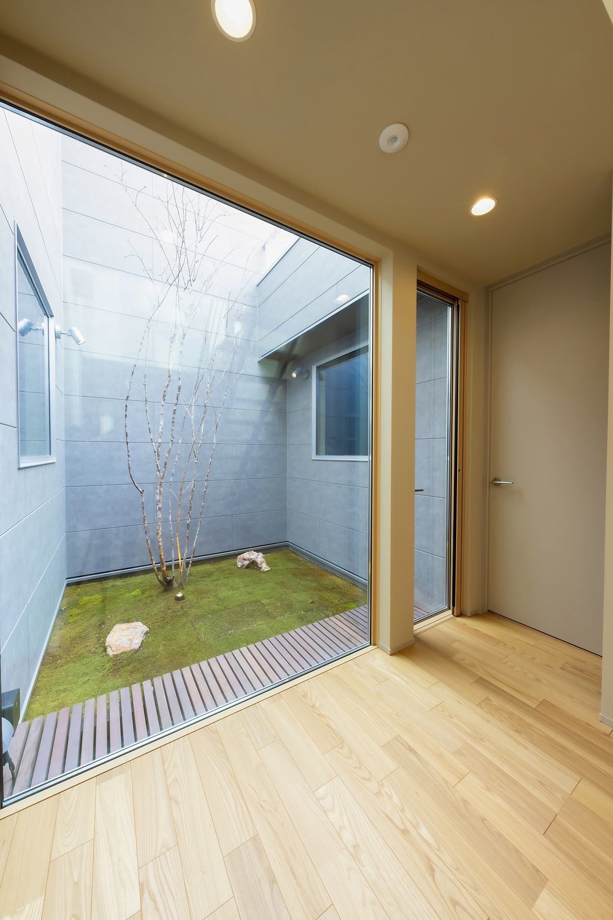 外からの視線を一切気にすることのない完全なプライベート空間な中庭は上部の吹き抜けにより、都市部の住宅地でも安定した採光を確保。1階の廊下や個室からは緑を愛でる「借景」として、2階からは季節の移ろいを見下ろす「中庭」として、多角的な表情を楽しむことができる、住まい全体の核となる場所です。
