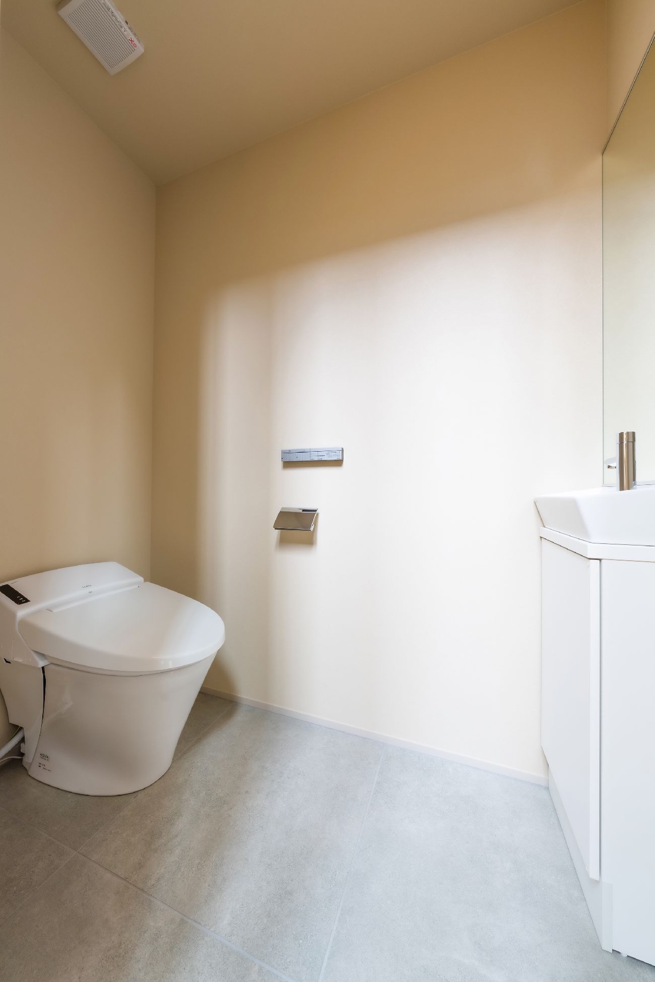 住まい全体のトーンを継承した洗練されたレストルーム。 あえて広めに確保した空間と、ノイズを削ぎ落としたタンクレスデザインが心落ち着く静かなひとときを演出します。毎日使う場所だからこそ、美しさと居心地の良さを究極まで追求しました。