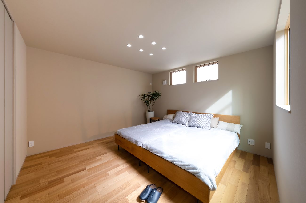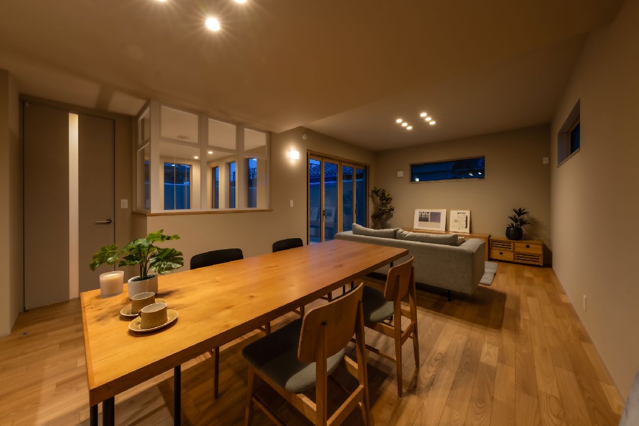 広々とした空間は、ジャパンディスタイルのミニマリズムを体現。こだわりのダウンライト配置が、夜はホテルのような上質さを演出します。