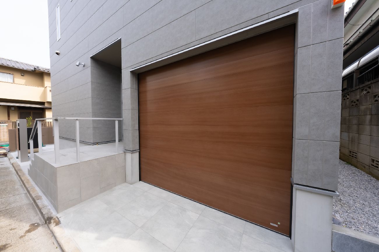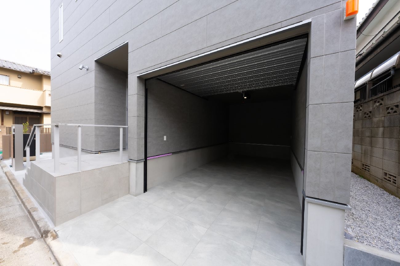 外壁と統一感のある上質な大判タイルで仕上げたガレージスペース。 シャッター付のインナーガレージは、大切な愛車を雨風から守るだけでなくメンテナンスやDIYを愉しむ「大人の隠れ家」としても機能します。