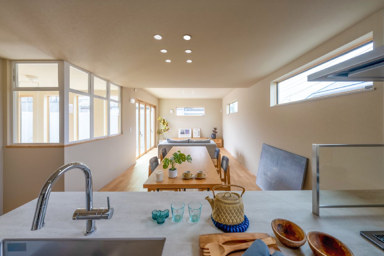 お料理をしながらダイニングでくつろぐ家族との会話を楽しむ。 リビングの先まで真っ直ぐに抜ける視界が開放感あふれる毎日を叶えます。