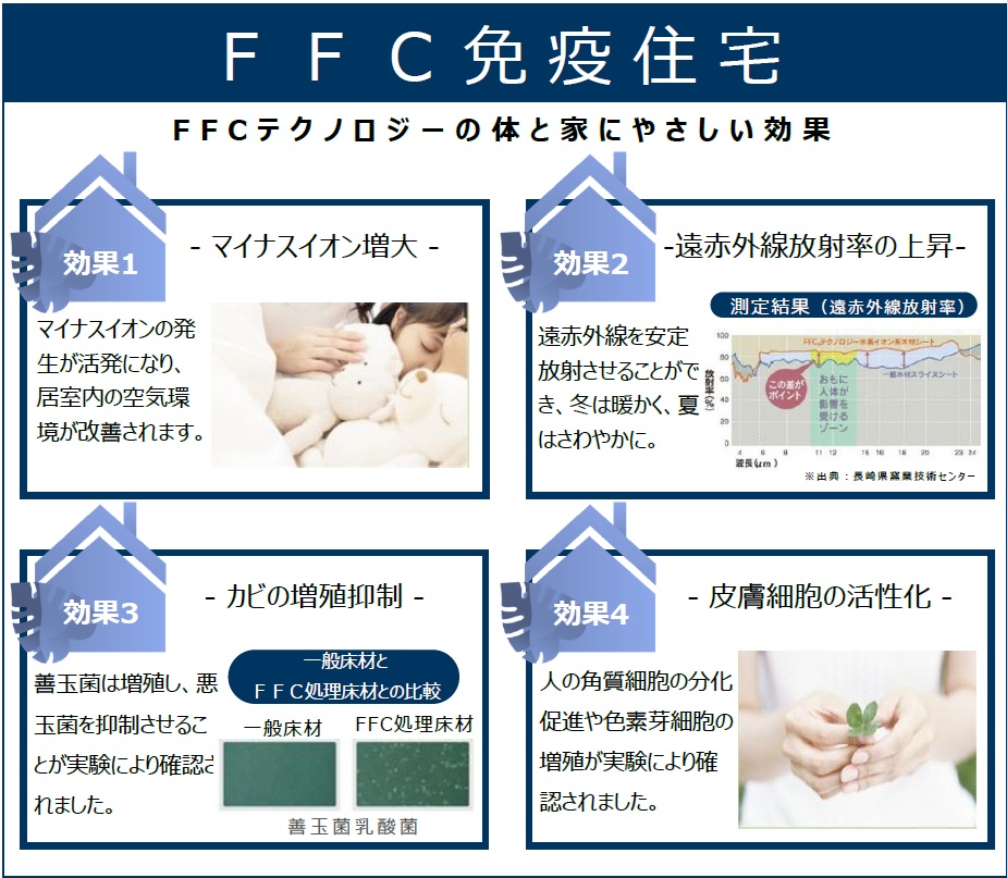 深呼吸したくなる家。FFC免疫住宅で、家族の健やかな毎日を。 家は、一日の大半を過ごす場所。だからこそ「空気の質」にこだわりました。FFC免疫住宅は、建材に含まれる水分に微量なミネラルを含ませることで、化学物質(ホルムアルデヒド等)の害を最小限に抑えます。 アレルギー体質のお子様がいらっしゃるご家庭や、新築特有のニオイが気になる方にも安心。まるで森の中にいるような、澄んだ空気に包まれる暮らしをご提案します。