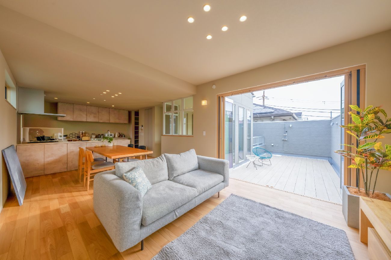 ご家族が集うLDKは、広々とした21帖。天井高に変化をつけた「折り上げ天井」が、さらなる開放感と上質な空間を演出します。 そして、リビングからフラットに繋がる大型バルコニー「ソライマ」は、まさに第二のリビング。青空の下でランチを楽しんだり、お子様のプール遊びや、夜は星空を眺めながらの晩酌など、日常を彩る特別な場所になります。 室内と屋外がシームレスに繋がる、光と風を感じる心地よい住まいを、ぜひ現地で体感してください。