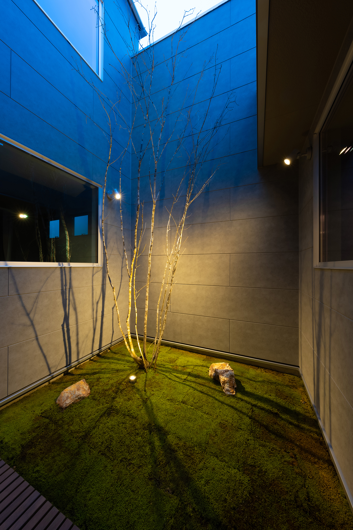 光と影が描く、わびさびの情景。アオダモが主役のプライベート・ガーデン。 玄関の扉を開けるたび凛としたアオダモの枝ぶりが住む人を迎えます。 足元を彩る柔らかなスナ苔の絨毯と、夜の静寂に浮かび上がる印象的な影。