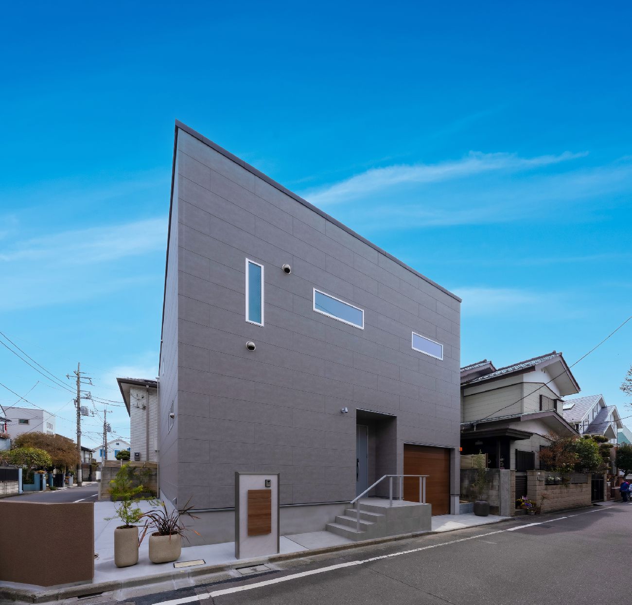 無機質なグレーのタイルに温かみのある木目調シャッターをアクセントにした洗練の外観デザイン。 シャッターを閉めることで建物の一体感が増し、外からの視線を遮る美しい「壁」として機能します。 生活感を感じさせないミニマルなスタイルは住む人のこだわりを雄弁に物語ります。