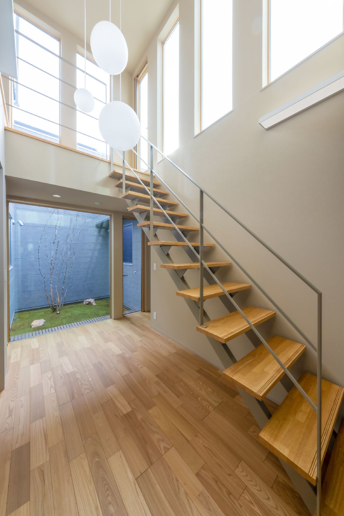 階段という機能的な要素を、住まいの中心を彩る美しいオブジェへと昇華させました。 踏板の間に隙間があるスケルトン構造の鉄骨階段は、2階の高窓から差し込む陽光を遮ることなく、1階の隅々まで届けます。