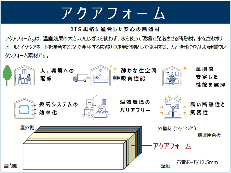 「アクアフォーム」は、現場で水を使い発泡させて吹き付ける断熱材です。わずかな隙間も逃さず、複雑な構造部分にもピタッと密着。まるでお家全体を高性能な魔法瓶で包み込んだような高い断熱性を発揮します。 冬の朝、布団から出るのが辛くない。そんな「温度差のない暮らし」が、家族の健康と快適な毎日を支えます。