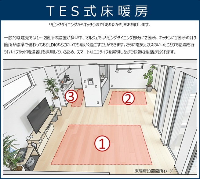 冬の朝、キッチンに立つのが辛くない。そんな暮らしを叶えるのが、LDKに贅沢に配置された3枚の床暖房です。 エアコンのように温風が顔に当たって乾燥することなく、遠赤外線の「輻射熱(ふくしゃねつ)」で足元からじんわりと体全体を温めます。埃が舞い上がらないので空気もクリーン。小さなお子様やペットがいるご家庭でも、家族全員が床の上でゴロゴロ寛げる、最高に心地よい空間が広がります。